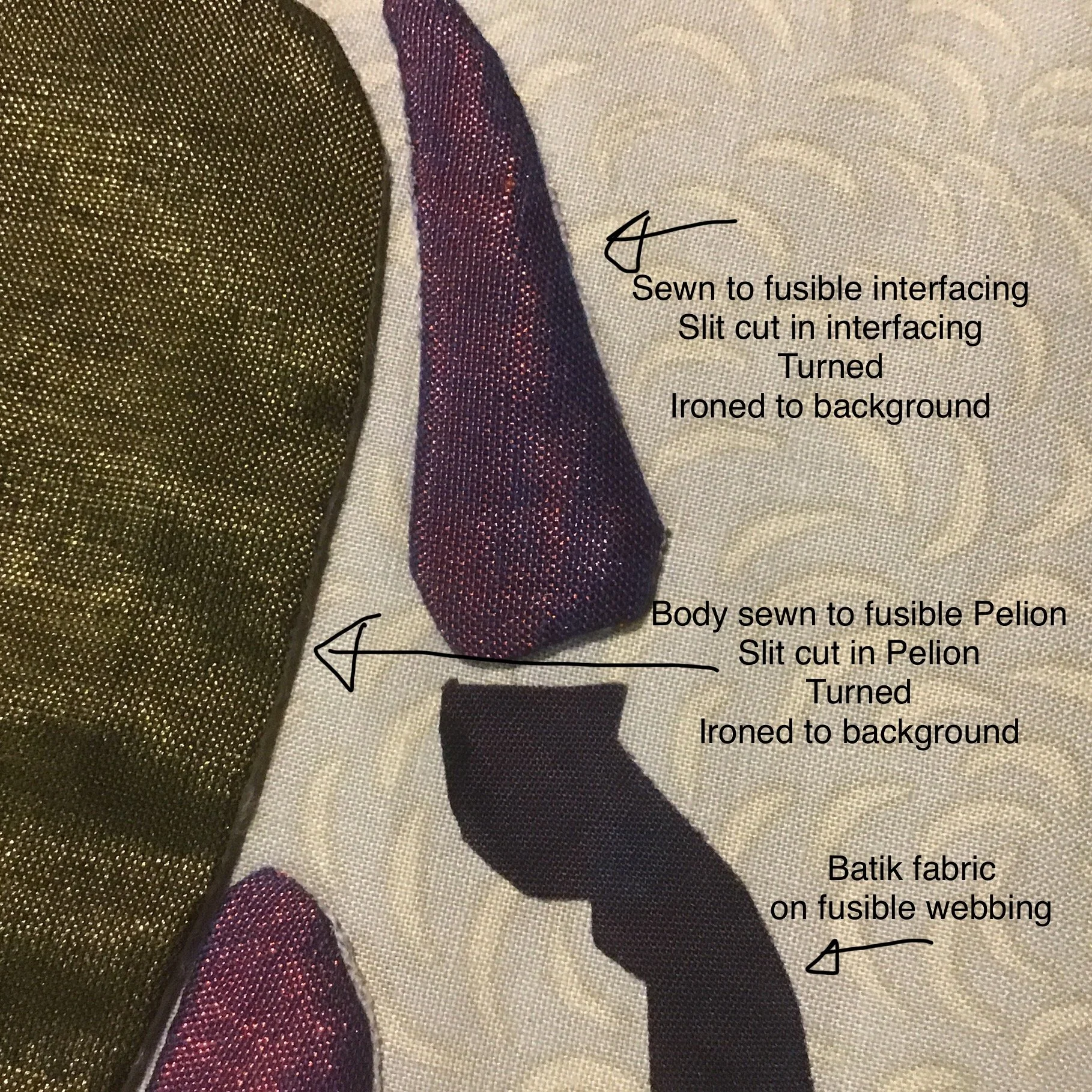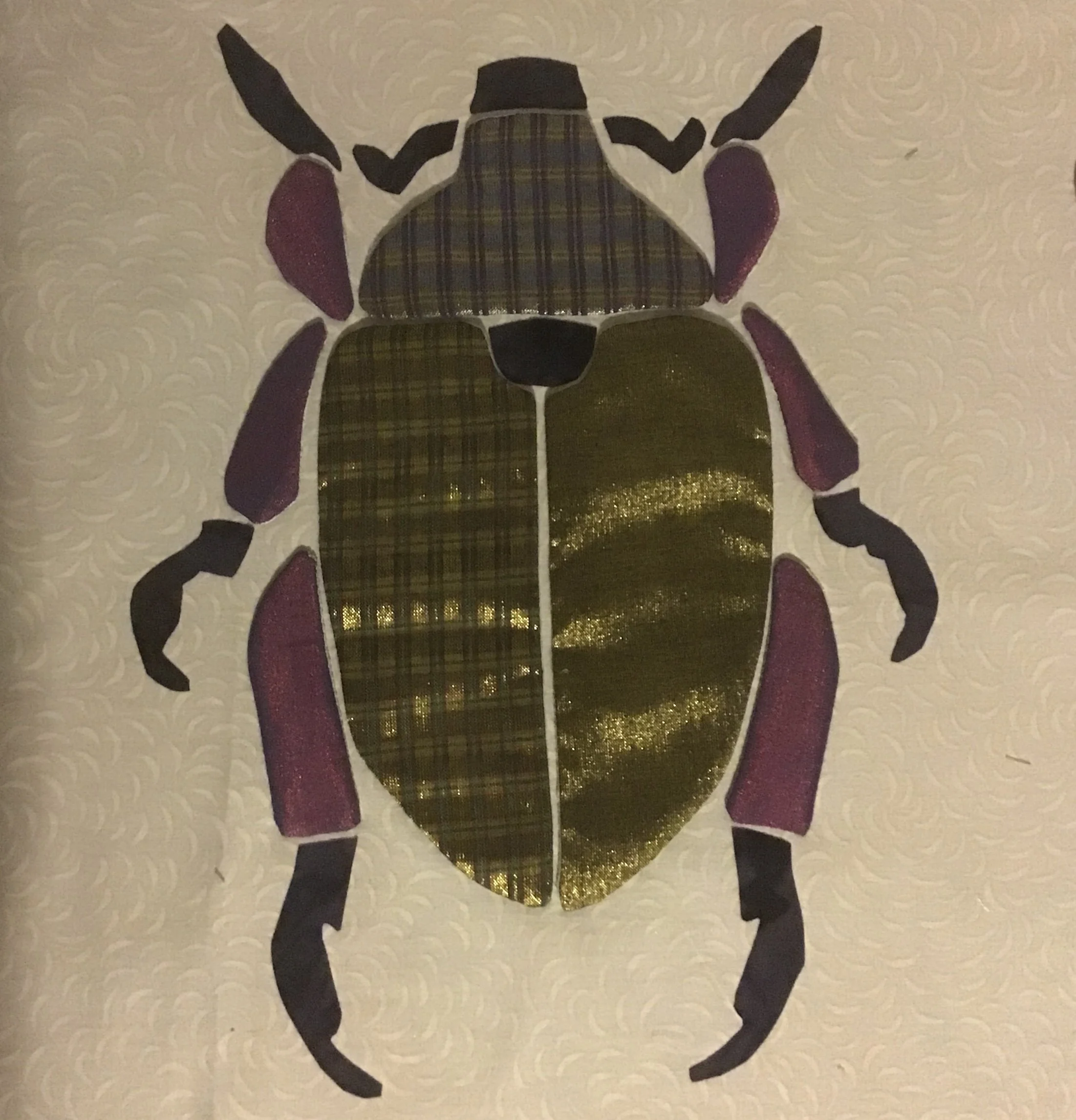 The shiny fabric for the legs and body, however, frays horribly so it needed a different technique. for the legs, I placed fusible interfacing sticky side to right side of the fabric. I sewed around the outline, trimmed and clipped curves, then slit the interfacing enough to turn the shape so all raw edges are concealed and the shape can be fused to the background. I used the same technique with body parts except instead of using interfacing, I used a fine pellon (very light fusible polyester wadding). This has made the bugs body puff up and the feet lie very flat.